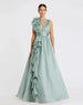 V-neck sleeveless ball gown with ruffled shoulder ruched empire waist and ruffles flowing down the skirt.