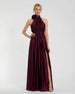 Elegant chiffon gown with a ruched bodice and waistband, an open back, and a rosette halter neckline. The flowing floor-length skirt features a thigh-high slit.