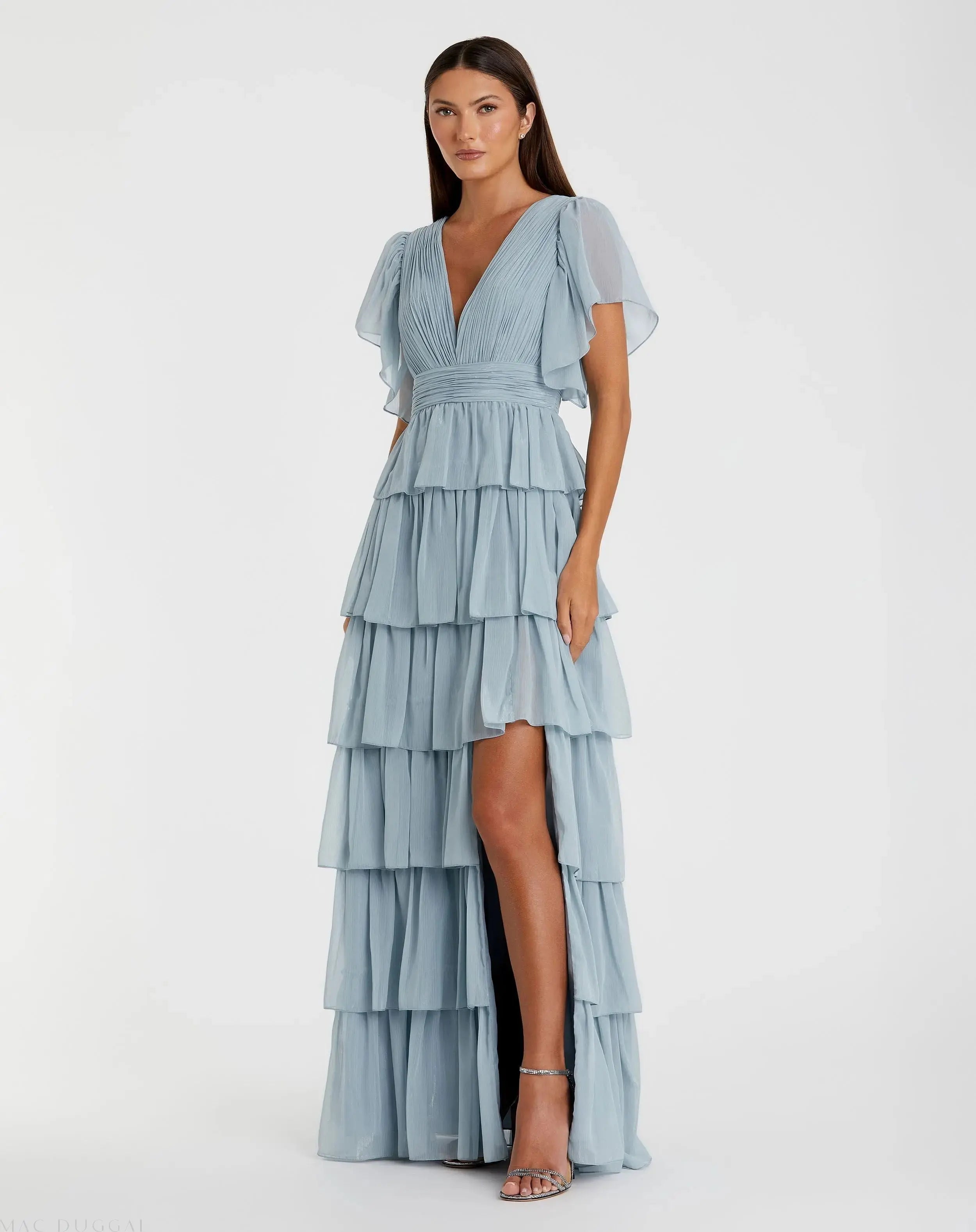 Crafted from chiffon fabric, this stunning gown features a tiered ruffle skirt, short flutter sleeves, and a thigh high slit, making it the perfect choice for any special occasion.