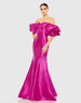 Crafted from elegant satin, this off-the-shoulder gown features puff sleeves and a sweeping train for a timeless silhouette.