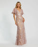 This stunning lace gown features a feminine neckline, short butterfly sleeves, and subtle floral sequin embellishments, making it a perfect, timeless choice for any formal occasion.