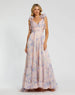 Gorgeous chiffon floral dress with cut-out sides and back, pleated bodice, and a sexy lace-up open back. Dramatic ruffles accent the shoulders, and a flowy tiered skirt completes the look.