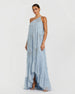 This stunning gown features intricate beaded and sequin detailing, a one shoulder neckline, and a subtle high low hem. The beaded bow embellishments add a unique and glamorous touch, making it the perfect gown for any special occasion.