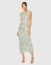 Stunning hand-beaded column dress with high neckline, sleeveless design, and fringe hem.